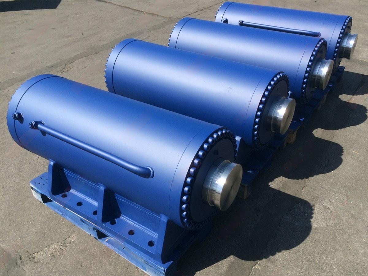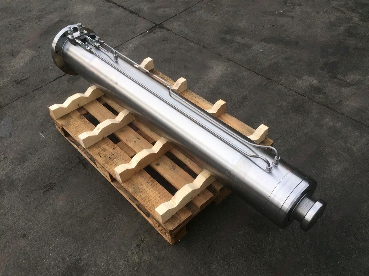 We offer tailor-made double-acting hydraulic cylinders manufactured according to your requirements. We can manufacture hydraulic cylinders with piston diameters up to 1.500 mm, stroke lengths up to 18.000 mm, and nominal pressures up to 700 bar. As the standard, the cylinder tube is made of DIN 2391 ST-52.3, BK+S material, and the piston rod of Ck45. However, the choice of material depends on the application and is customized to your requirements, e.g. it can be made of stainless steel, 42CrMo4, 39NiCrMo3, 20MnV6K, etc. The piston rod can be Chrome-plated, NiCr-plated, or Ceramic-coated.